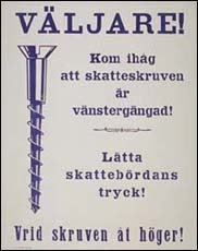 1921 så stod det att läsa på Moderaternas (Högerpartiets) val-affisher: Väljare! Kom ihåg att skatteskruven är vänstergängad! Lätta skattebördans tryck! Vrid skruven åt höger!